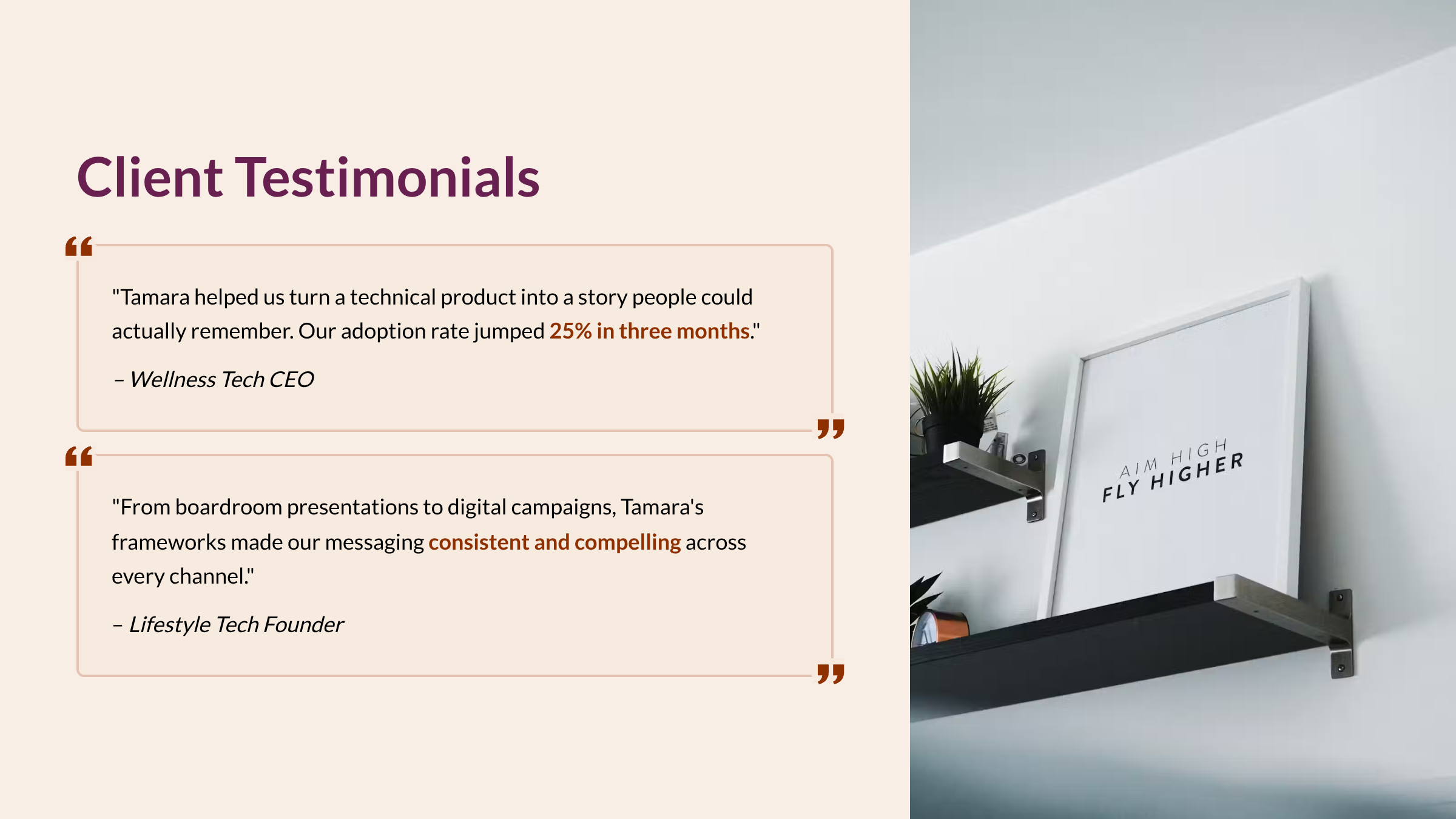 Monthly check-ins, quarterly recalibrations, and on-call brand advisory ensure your story evolves with your business — so you never fall behind again.